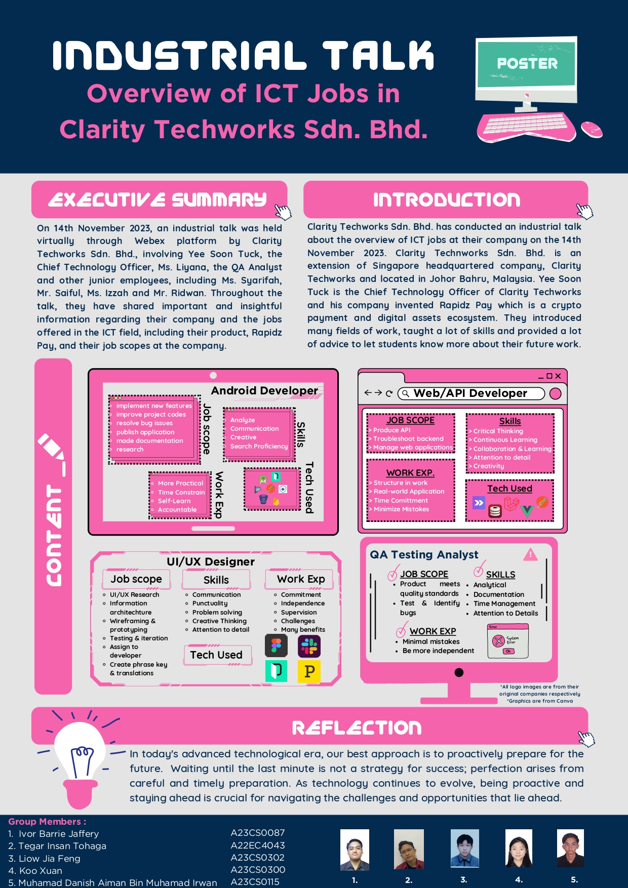 Throughout this online industrial talk, I learned a lot especially the wide range of jobs when it comes to sofiware engineering. Be it as an Android Developer or Web/API Developer, as long as I work hard and focus on my studies, I can also achieve success just like the junior employees of Clarity Techworks. The most important aspect is that I must be passionate about all things computer science, and to improve my skills overtime throughout my journey in UTM.